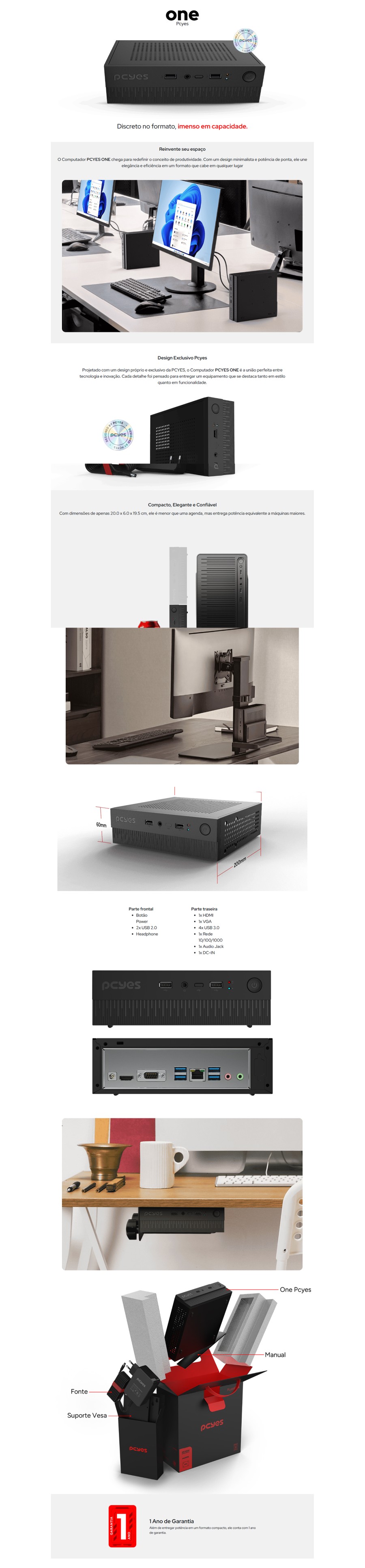 Projetado com um design próprio e exclusivo da pcyes, o computador pcyes a união perfeita entre tecnologia e inovação. Cada detalhe foi pensado para entregar um equipamento que se destaca tanto em estilo quanto em funcionalidade compacto, elegante e confiável com dimensões de apenas 20.0 x 6.0 x 19.5 cm, ele é menor que uma agenda, mas entrega potência equivalente a máquinas maiores parte frontal botão power2x usb 2.0headphone